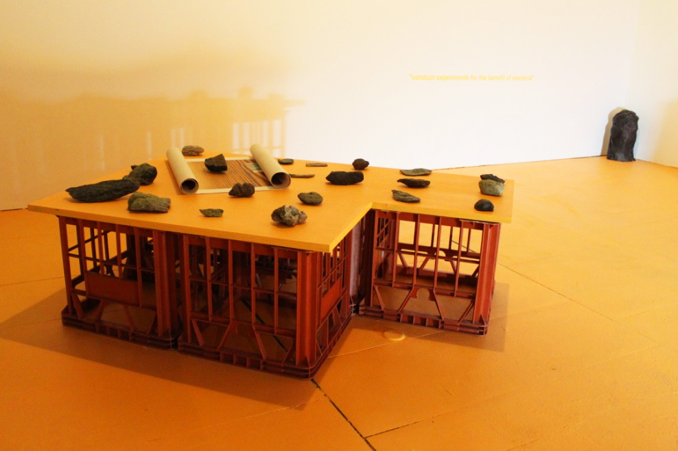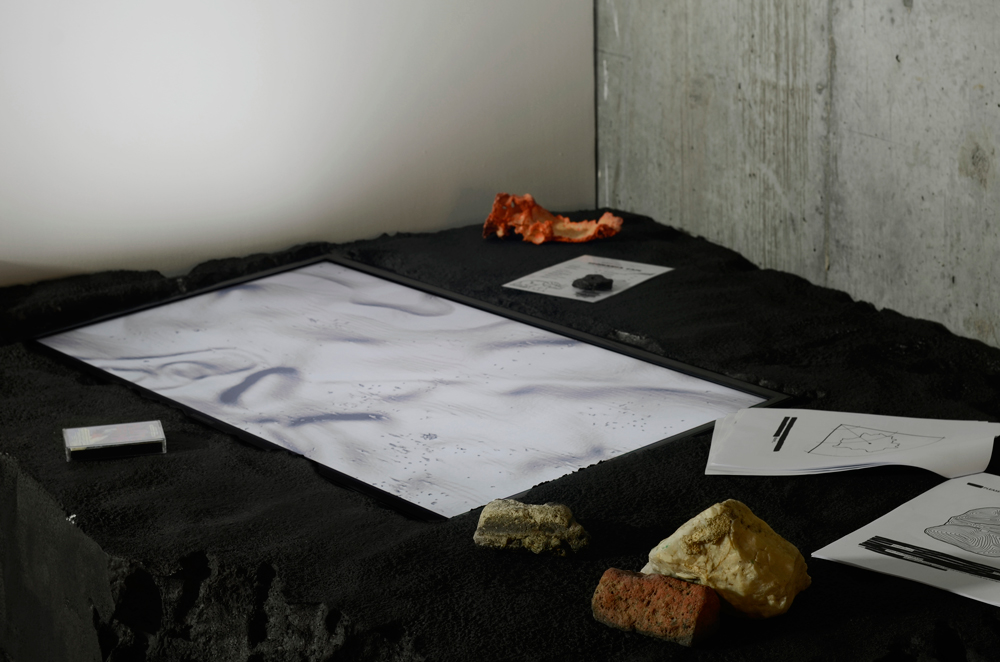 K: There is a big monolith and some rocks and a flag and some prints and some other things.